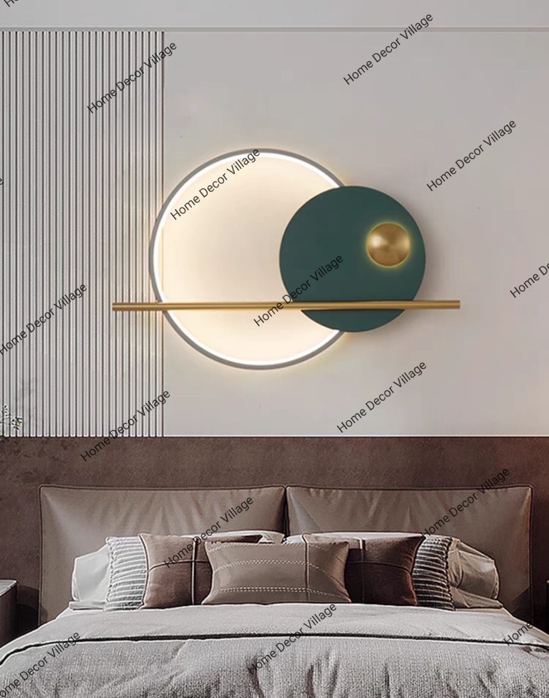 The unique geometric circular design with golden accents creates a striking focal point, making it ideal for bedrooms, living rooms, offices, or luxury interiors. The soft LED illumination provides ambient lighting, offering both style and functionality.